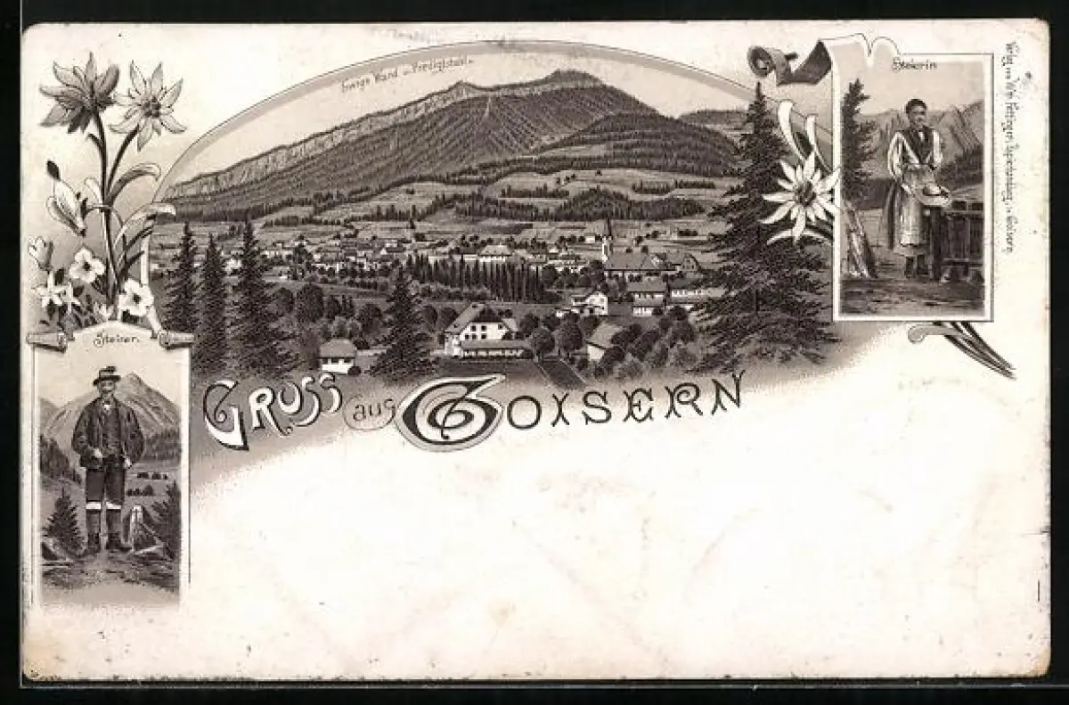 Lithographie Goisern, Ewige Wand und Predigtstuhl, Mann und Frau in Trachten