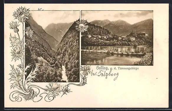 Lithographie Golling, Teilansicht g. d. Tännengebirge, Ortspartie