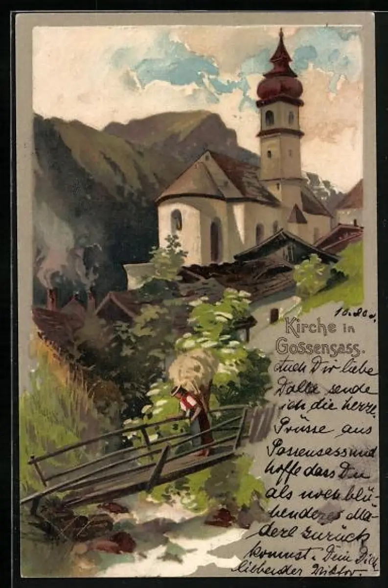 Lithographie Gossensass, Idyll bei der Kirche
