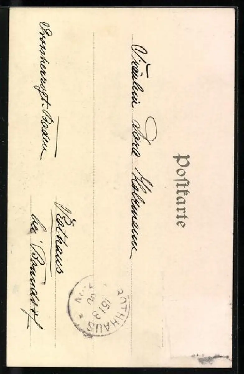 Personenbezogene Daten auf der Rückseite der Karte wurden durch blauen Textmarker unkenntlich gemacht. Die blauen Stellen sind auf die Vorderseite durchgeweicht und wirken sich negativ auf das Postkartenfoto aus