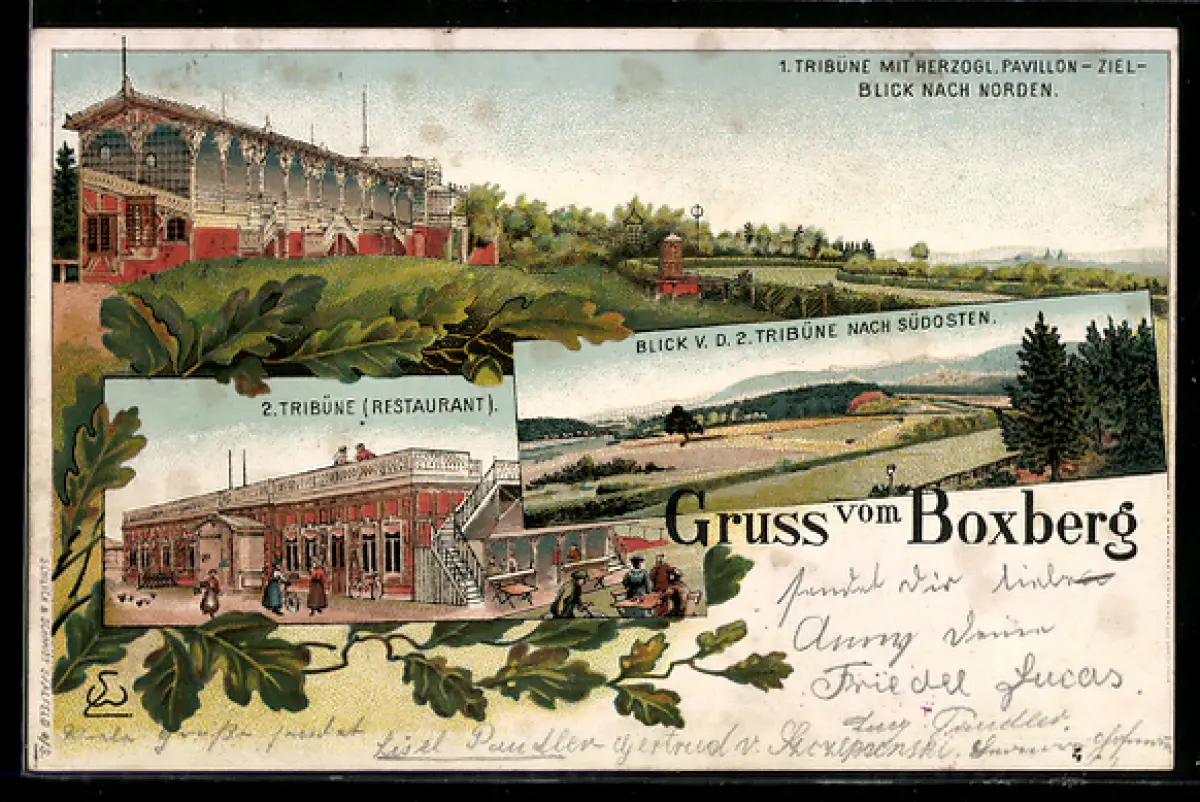 Lithographie Gotha, Boxberg-Rennbahn, 1. u. 2. Tribüne mit Restaurant