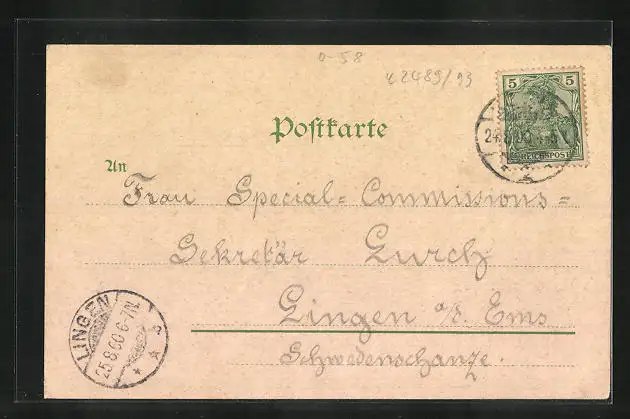 gelaufen 1900, Einriss li. unten, Eckknick re. oben, guter Zustand