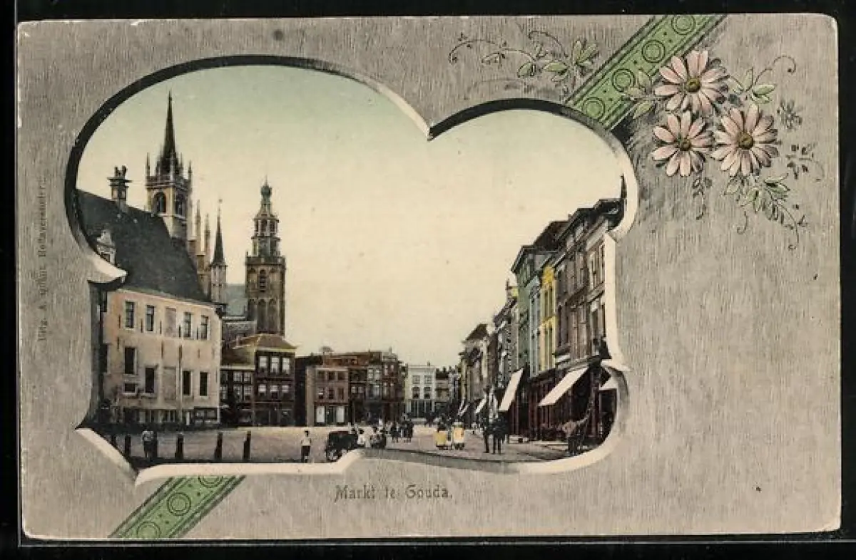 Lithographie Gouda, Markt, Margeriten, Passepartout