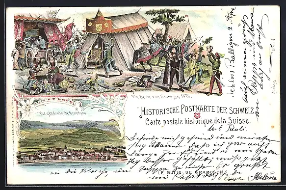 Lithographie Grandson, Vue générale, die Beute nach der Schlacht 1476, le butin