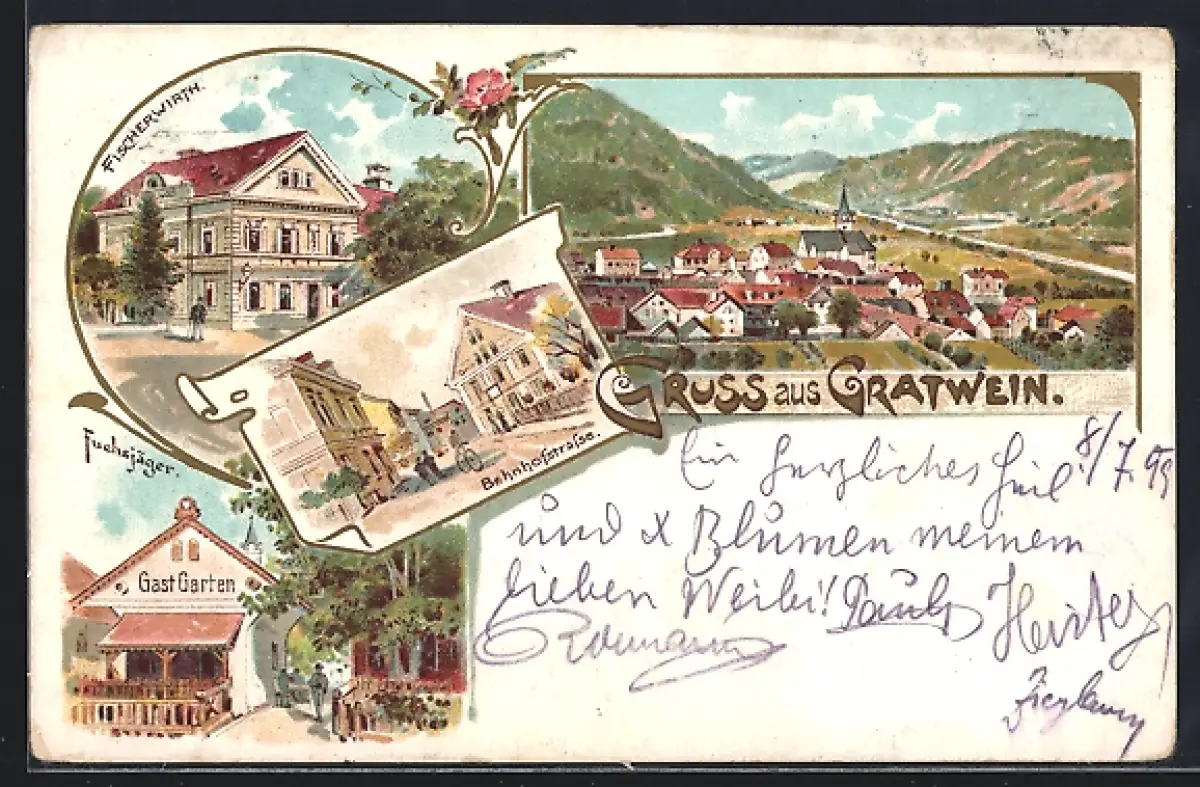 Lithographie Gratwein, Gasthaus Fuchsjäger, Fischerwirt, Ortsansicht mit Kirche, Bahnhofstrasse