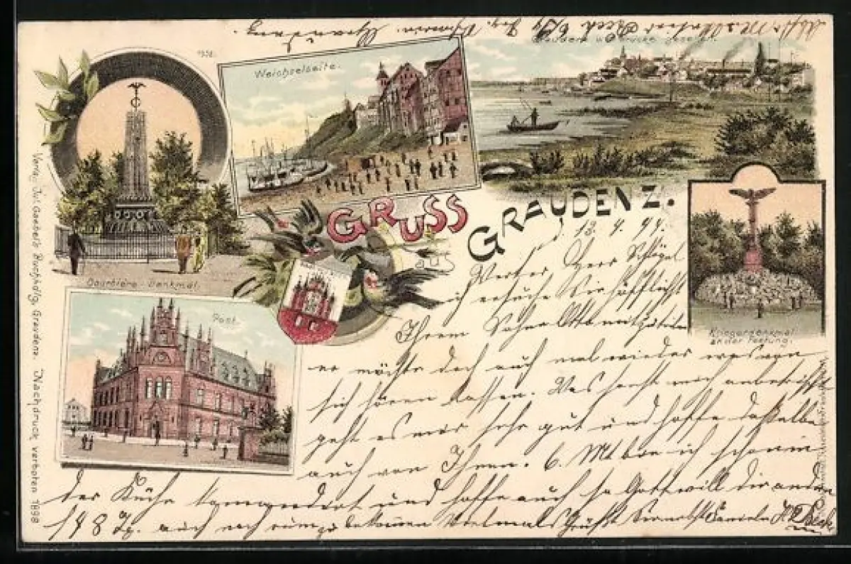 Lithographie Graudenz, Courbiére Denkmal, Kriegerdenkmal an der Festung, Post, Wappen