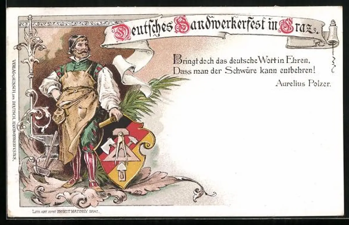 Lithographie Graz, Deutsches Handwerkerfest, Schmied mit Wappenschild, Aurelius Polzer