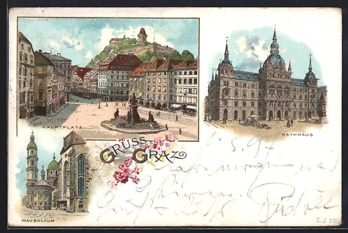Lithographie Graz, Hauptplatz, Rathaus, Mausoleum