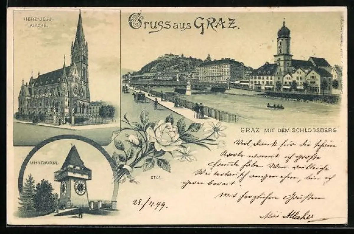 Lithographie Graz, Herz Jesu-Kirche, Uhrturm, Flusspartie mit dem Schlossberg