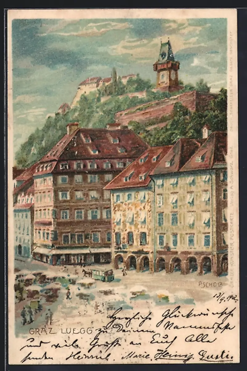Lithographie Graz, Luegg mit Pferdebahn und Markt