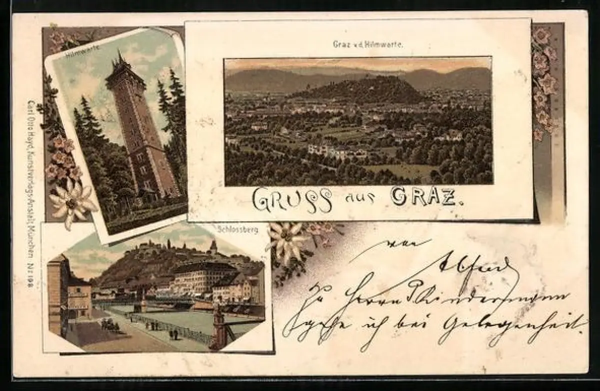 Lithographie Graz, Ortsansicht v. d. Hilmwarte, Hilmwarte, Schlossberg