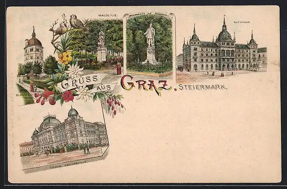 Lithographie Graz, Rathaus, Techn. Hochschule, Auersberg-Denkmal