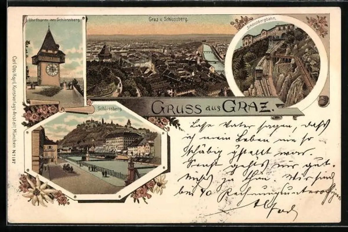 Lithographie Graz, Schlossbergbahn, Uhrturm, Schlossberg