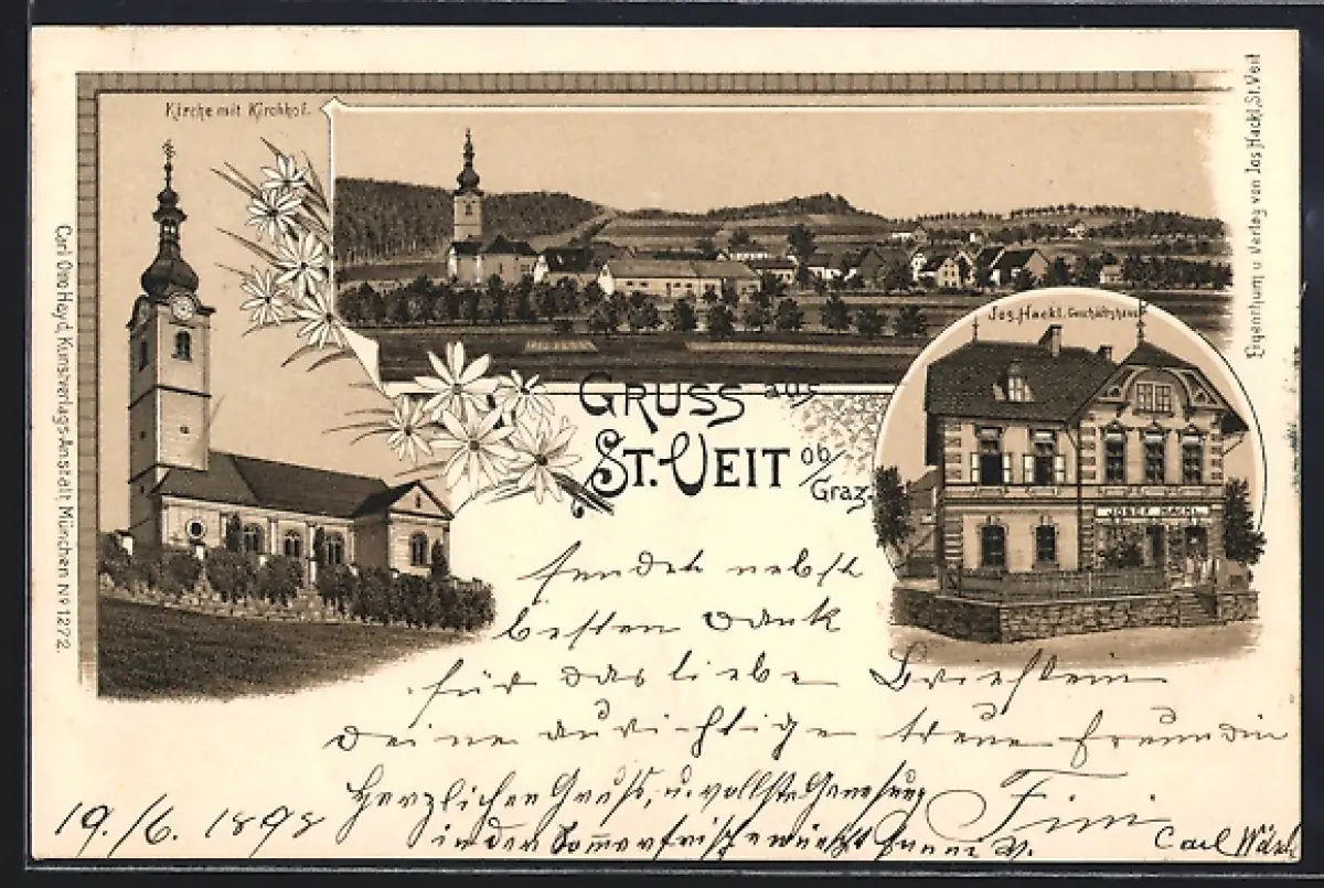Lithographie Graz, St. Veit, Jos. Hackls Geschäftshaus, Kirche und Totalansicht