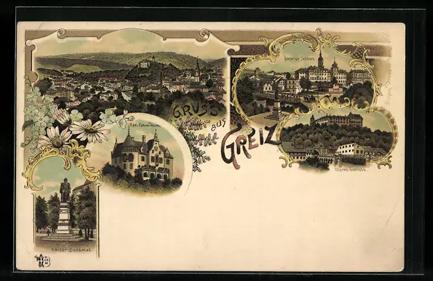 Lithographie Greiz, Unteres und oberes Schloss, Old-Fellow-Heim, Ortsansicht