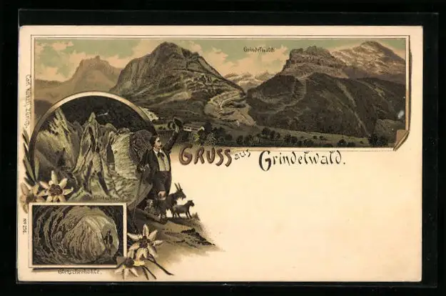 Lithographie Grindelwald, Gletscher u. Gletscherhöhle, Gesamtansicht