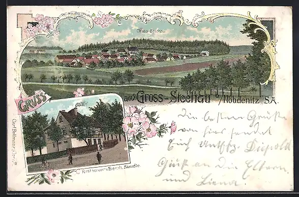 Lithographie Gross-Stechau b. Nöbdenitz, Restaurant v. Bernh. Staudte, Ortsansicht