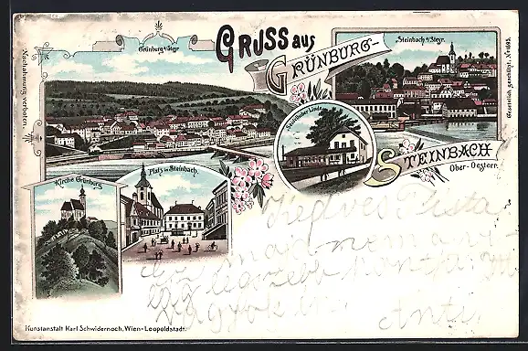 Lithographie Grünburg /O.-Oe., Grünburg, Steinbach, Gasthof Seidelhuber Linde, Platz in Steinbach, Kirche in Grünburg