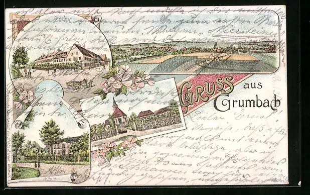 Lithographie Grumbach, Gasthof, Kirche, Schule