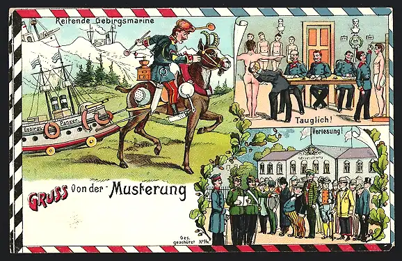 Lithographie Gruss von der Musterung, Reitende Gebirgsmarine mit Kaffeemühle