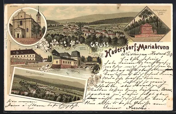 Lithographie Hadersdorf-Weidlingau, Mariabrunn, Gesamtansicht, Wallfahrtskirche, Forstschule