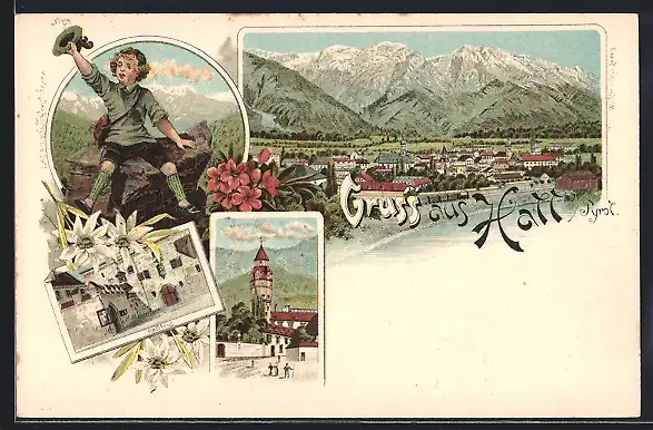 Lithographie Hall /Tyrol, Rathaus, Kirche und Totalansicht