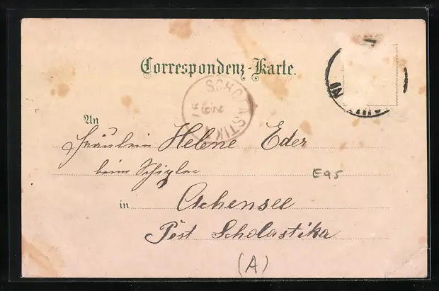 Personenbezogene Daten auf der Rückseite der Karte wurden durch blauen Textmarker unkenntlich gemacht. Die blauen Stellen sind auf die Vorderseite durchgeweicht und wirken sich negativ auf das Postkartenfoto aus