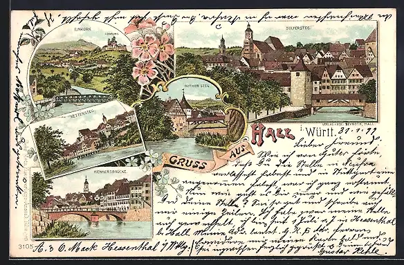 Lithographie Hall i. Württ., Henkersbrücke, Kettensteg, Roter Steg
