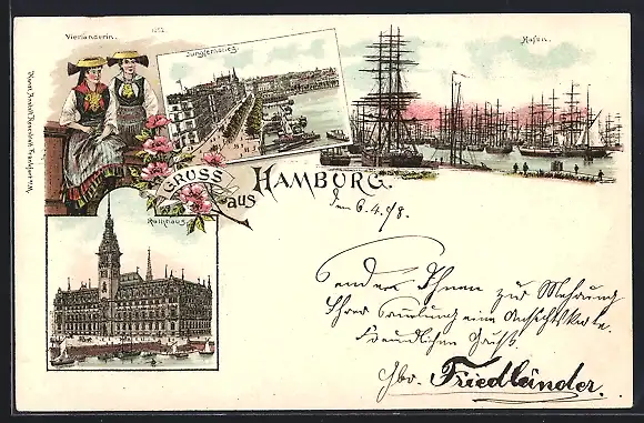 Lithographie Hamburg, Hafen, Jungfernstieg, Rathaus