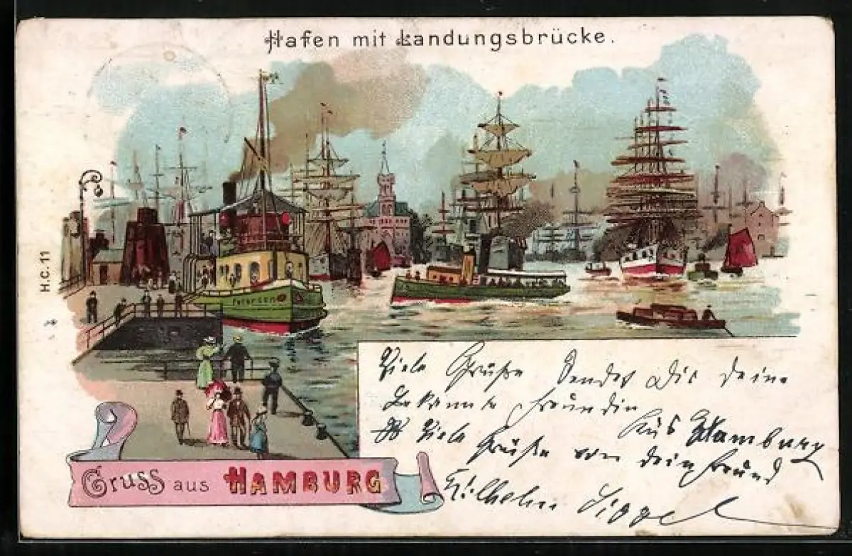 Lithographie Hamburg, Hafen, Landungsbrücke, Dampfer, Segelschiffe