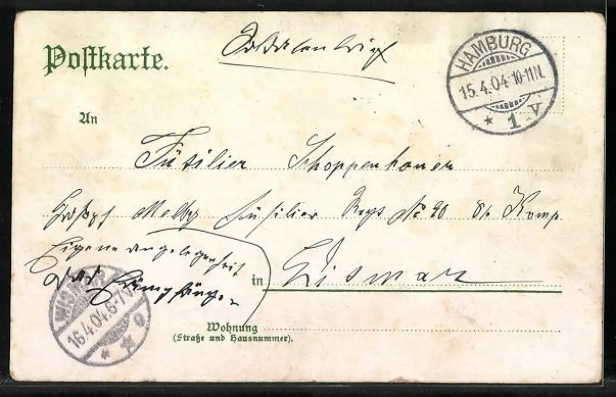 Personenbezogene Daten auf der Rückseite der Karte wurden durch blauen Textmarker unkenntlich gemacht. Die blauen Stellen sind auf die Vorderseite durchgeweicht und wirken sich negativ auf das Postkartenfoto aus