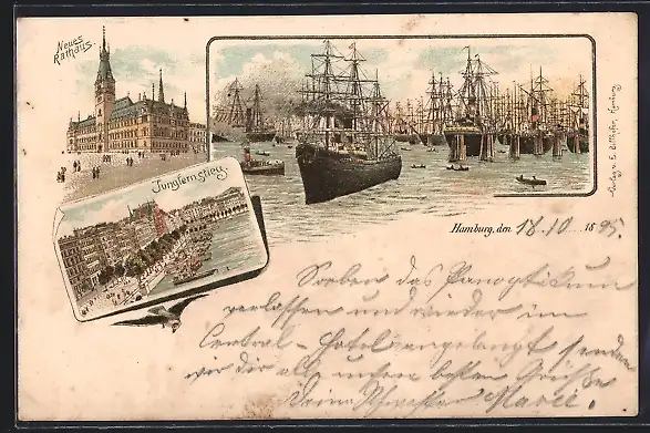 Lithographie Hamburg, Jungfernstieg, Hafen mit Schiffe, Neues Rathaus