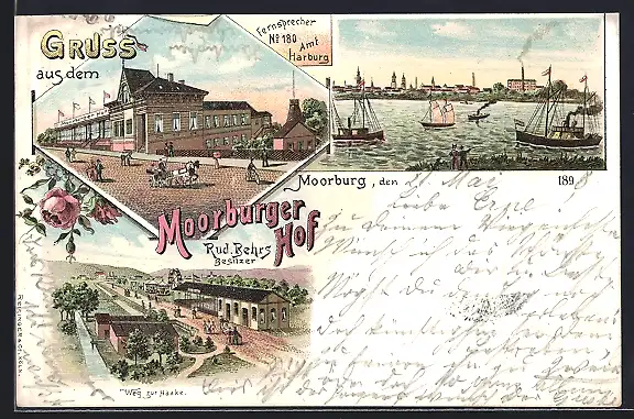 Lithographie Hamburg-Moorburg, Gasthaus Moorburger, Hof, Weg zur Haake, Uferpartie mit Booten