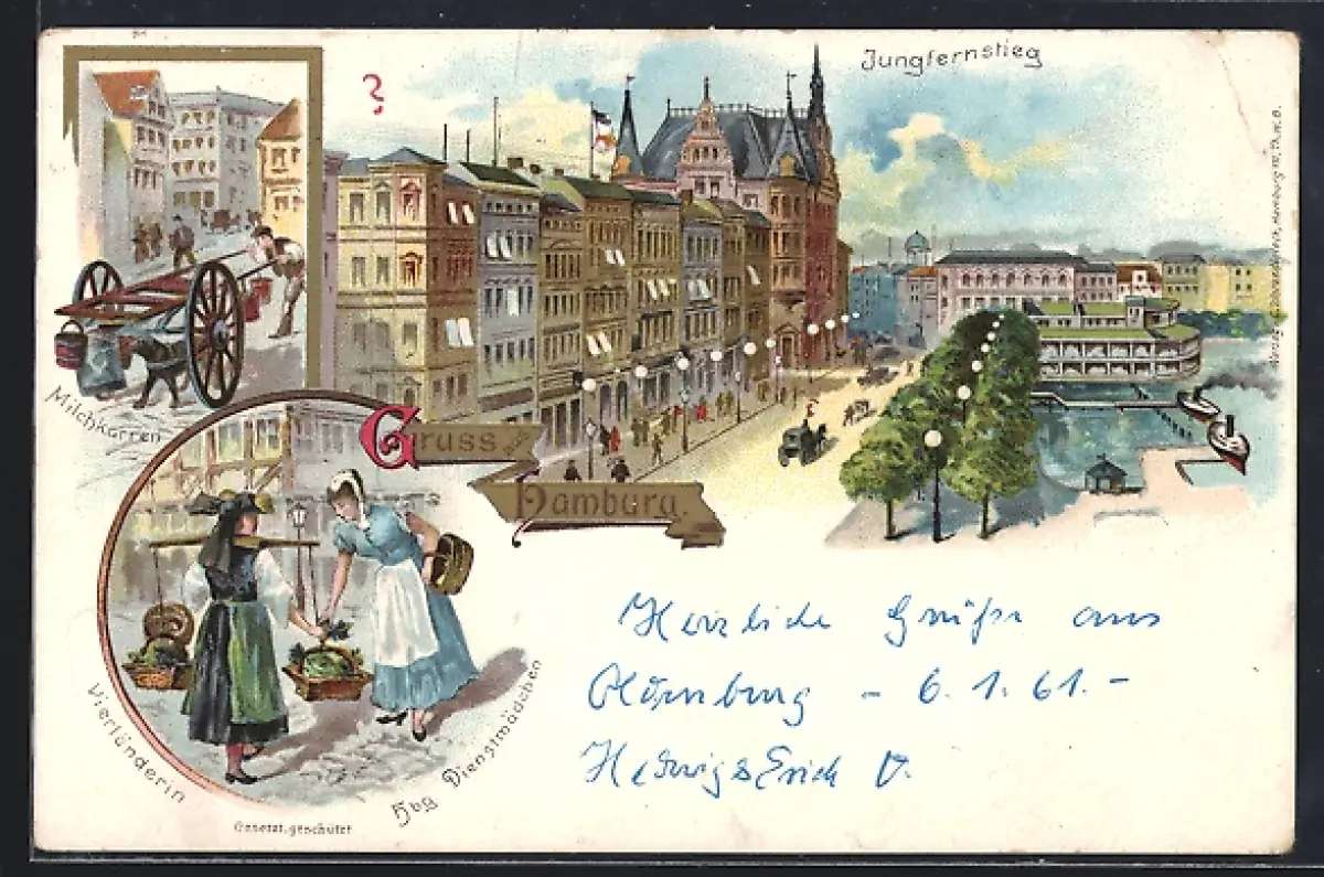 Lithographie Hamburg-Neustadt, Milchkarren, Vierländerin, Jungfernstieg