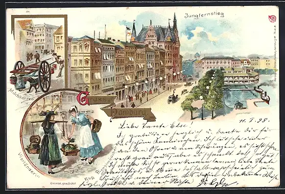 Lithographie Hamburg-Neustadt, Vierländerinnen auf dem Markt, Milchkarren, Jungfernstieg