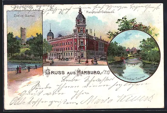 Lithographie Hamburg-Neustadt, Zoologischer Garten, Hauptpost-Gebäude, Botanischer Garten