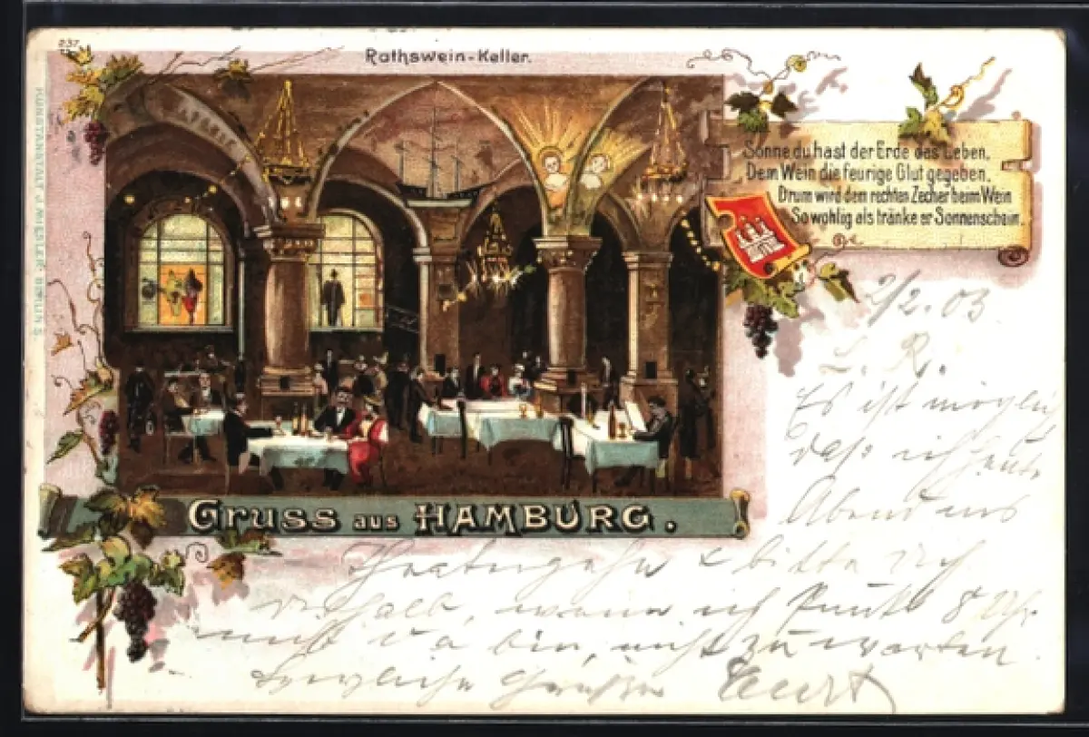 Lithographie Hamburg, Rathswein-Keller, Innenansicht, Wappen
