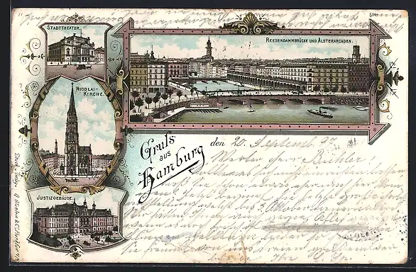 Lithographie Hamburg, Reesendammbrücke und Alsterarcaden, Stadttheater, Nicolaikirche