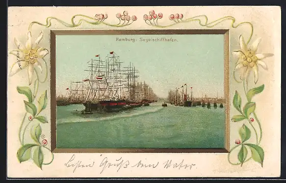 Lithographie Hamburg, Segelschiffhafen im Passepartout-Rahmen