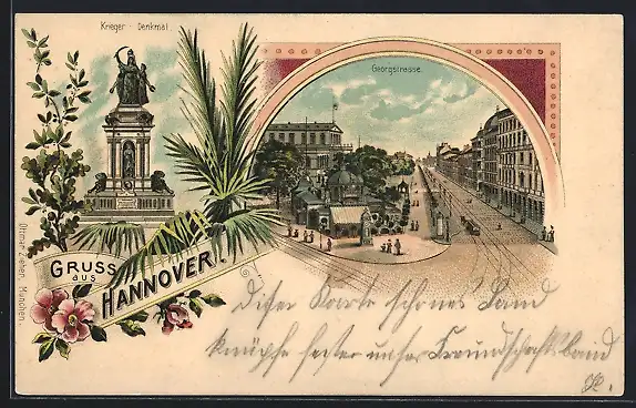 Lithographie Hannover, Georgstrasse, Krieger-Denkmal