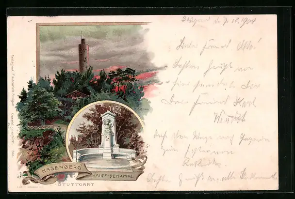 Lithographie Hasenberg, Turm und Hauff-Denkmal