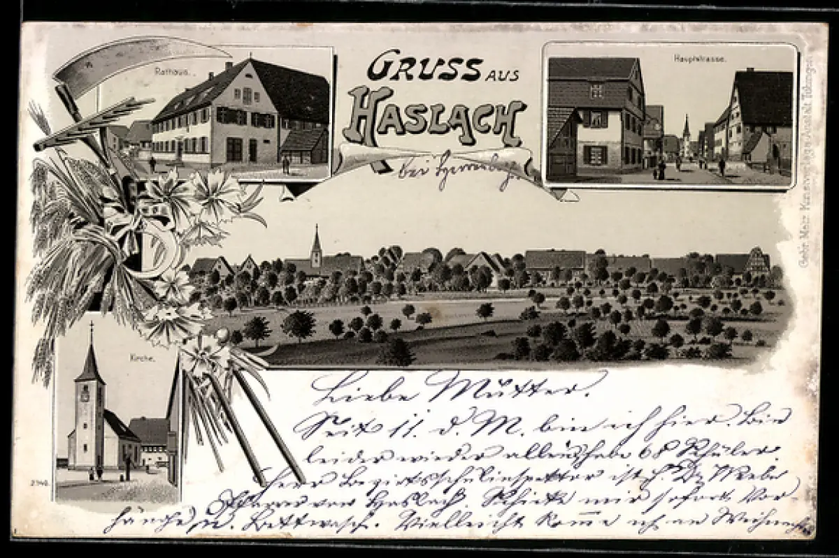 Lithographie Haslach, Hauptstrasse, Rathaus, Kirche