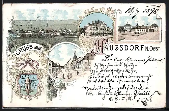 Lithographie Haugsdorf /N.Oest., Strassenpartie, Platz mit Denkmal, Wappen