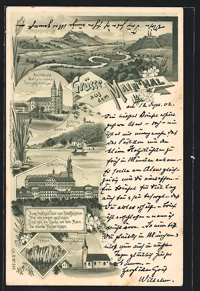 Lithographie Hausen /Mainthal, Basilika und Wallfahrtskirche Vierzehn Heiligen, Schloss Banz