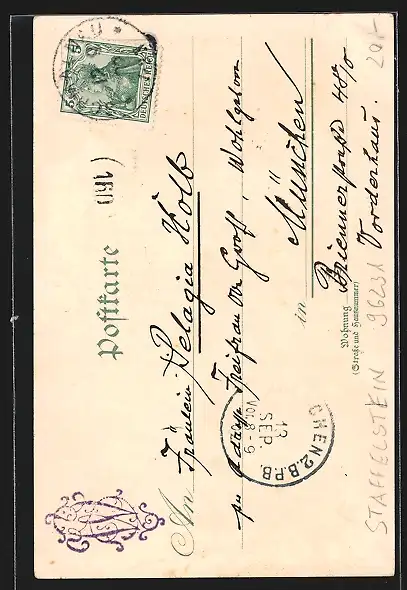 gelaufen 1902, Eckknick re. utnen, kleiner Einriss oben li., guter Zustand
