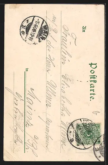 gelaufen 1900, Eckknicke li. oben u. re. unten, rückseitig Oberflächenschaden, minimale Einrisse li. u. re. oben, guter Zustand