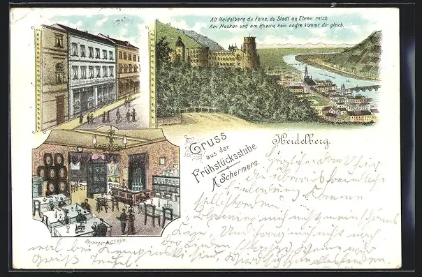 Lithographie Heidelberg, Frühstücksstube A. Schermers, Totalansicht