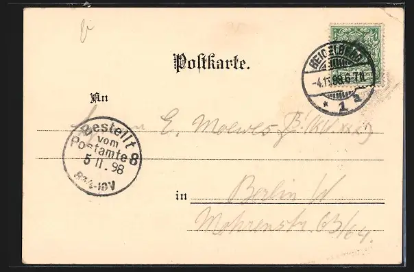 gelaufen 1898, Eckknick oben links, guter Zustand