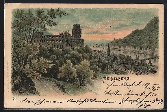 Lithographie Heidelberg / Neckar, Ortsansicht aus der Vogelschau