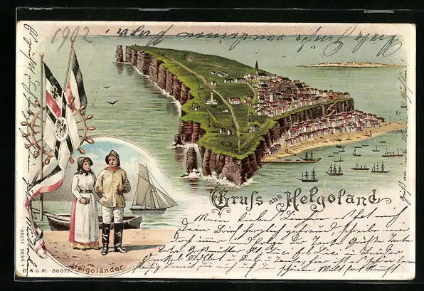 Lithographie Helgoland, Gesamtansicht von oben, Helgoländer Fischerpaar